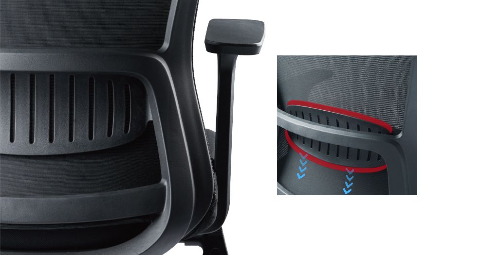 The centre widening design better fits the human lumbar region, allowing the seat to adapt to the sitting position changes of human body.